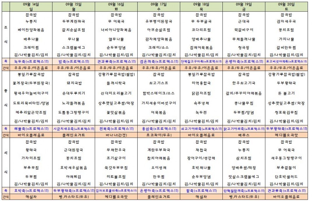 주간식단표(25.09.14-09.20) 페이지 정보 보현행원 작성일25-09-11 17:53 조회112회 관련링크 본문 * 변비어르신은 호전을 위해 무가당플레인요거트를 제공하며 영양균형을 위해 메디웰. 단백질보충제를 제공합니다. * 된장, 고추장, 간장, 매실청은 국내산 재료로 직접 담급니다. * 친환경식재료로 국산콩으로 만든 두부, 순두부, 국산콩청국장, 뽕잎가루, 강황가루를 사용합니다. * 식단 및 간식은 사정 상 변경될 수 있습니다. 간식은 아침은 우유 또는이온음료로 정해져있으며 점심과 저녁 식후에도 다양한 간식을 제공합니다. 이전글 다음글 목록