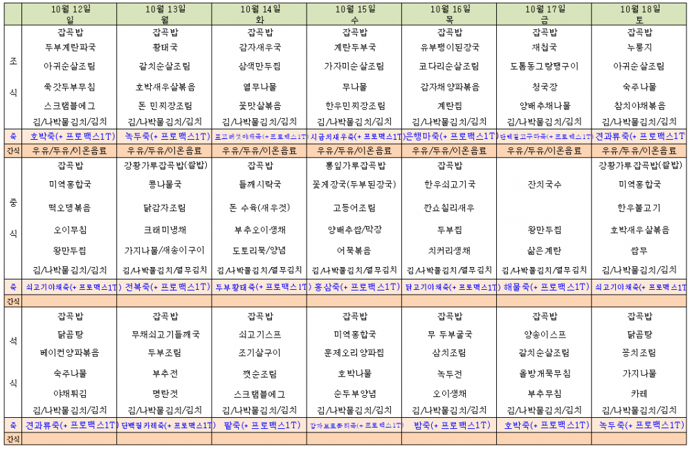 주간식단표 (25.10.12-10.18) 페이지 정보 보현행원 작성일25-10-08 16:43 조회59회 관련링크 본문 * 변비어르신은 호전을 위해 무가당플레인요거트를 제공하며 영양균형을 위해 메디웰. 단백질보충제를 제공합니다. * 된장, 고추장, 간장, 매실청은 국내산 재료로 직접 담급니다. * 친환경식재료로 국산콩으로 만든 두부, 순두부, 국산콩청국장, 뽕잎가루, 강황가루를 사용합니다. * 식단 및 간식은 사정 상 변경될 수 있습니다. 간식은 아침은 우유 또는이온음료로 정해져있으며 점심과 저녁 식후에도 다양한 간식을 제공합니다 다음글 목록