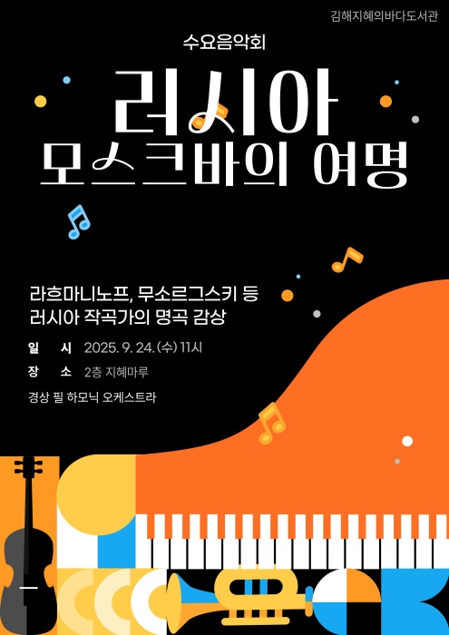 김해지혜의바다도서관 수요음악회 '러시아 모스크바의 여명' 페이지 정보 보현행원 작성일25-09-24 14:07 조회69회 관련링크 본문 <김해지혜의바다도서관 수요음악회'러시아 모스크바의 여명' >김해지혜의바다도서관에서 진행된수요음악회 "러시아 모스크바의 여명 "공연을 관람하였습니다.라흐마니노프, 무소르그스키러시아작곡가의 명곡감상타임!어르신들 모두 행복한 공연관람 되었습니다.^^ 이전글 다음글 목록