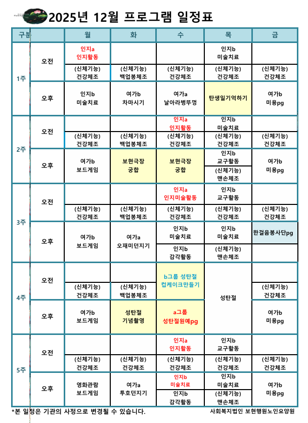 2025년 12월 프로그램일정표 페이지 정보 보현행원 작성일2025-12-01 13:52 조회103회 관련링크 본문 프로그램은 기관의 사정에 따라 변경될 수 있습니다. 이전글 다음글 목록